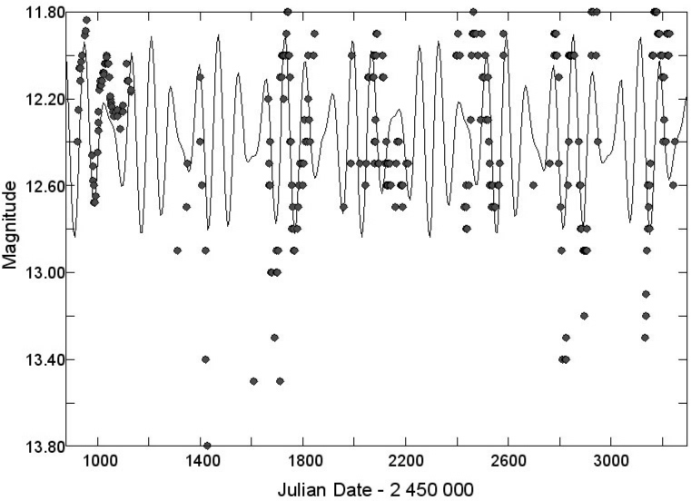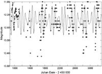 There is also some evidence for a gradual increase in mean visual magnitude from 12.2 in 1985-88 to 12.4 in 1999-2004 but, given the uncertainly of at least 0.1 in these means, the increase cannot be regarded as significant. The mean V magnitude in 1998-1999 was 12.30, compared with the mean value of 12.55 found by Demers (1973). This change is in the opposite sense to that of the visual observations. A look at the AAVSO on-line light curve, which is well-covered from JD 2445500 on, also suggests that any variations in mean magnitude are lost in the noise.