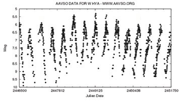 Near the tail end of the expansive constellation of Hydra the sea serpent resides the bright southern semiregular-type variable star W Hydrae. The period of W Hya is just shy of a year at 361 days. Based on over 3,400 observations in the AAVSO International Database, the variable has a magnitude range of 5.7-10.0, making W Hya a great star for observers with binoculars and/or small telescopes who can observe to -28 degrees declination.