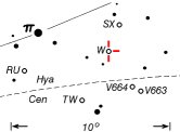 | W Hya's position relative to the bright star pi Hya and some other variable stars in the field. |