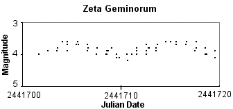 Our sparkling star, Zeta Gem, is classified as a Delta Cephei type variable despite a rather blatant deviation from its prototype star. Delta Cep stars display a distinctive "fin-like" shape, characterized by a steep rise to maximum, a brief pause while at its brightest, and then a gradual decline to minimum. Zeta Gem, however, has a rather symmetric light curve, with the declining and rising phases each taking half of the 10.15-day cycle. In some instances, there also seems to be a "hump" on the ascending branch of Zeta Gem. Regardless of this disparity, Zeta Gem has a period of 10.15 days, a .6 change in magnitude and a period-luminosiy relation that classifies it among the Delta Cephei type pulsating variable stars.