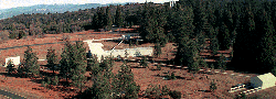 | An aerial view of the Palomar Testbed Interferometer, funded by NASA to demonstrate technology for ground-based interferometry. Light collected by three small telescopes in the three small buildings is directed through pipes to the central beam combining building. The separation among the three telescopes is 110 meters. |