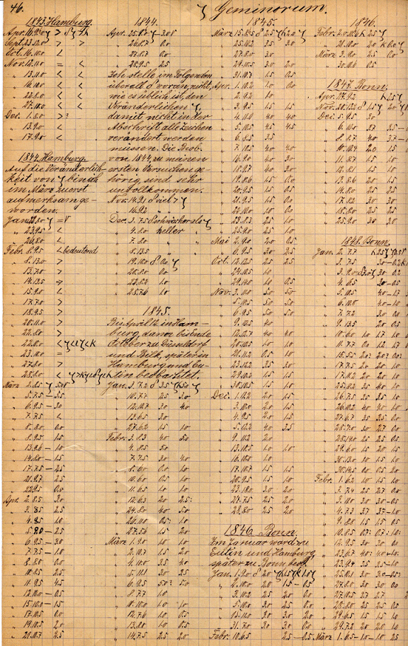 Julius F. J. Schmidt, who later became a famous selenographer (cartographer of the moon), suspected the variability of Zeta Geminorum in 1844, when he was still a teenage amateur. Three years later, in 1847, when a student at Bonn University studying under the great variable star astronomer, F. Argelander, Schmidt confirmed the discovery of Zeta Gem. An extremely well-organized manuscript of J. F. J. Schmidt's observations from the 1840s to 1870s currently resides in the archive room at AAVSO headquarters in Massachusetts. These observations were sent to the director of the Harvard College Observatory at the time, Edward C. Pickering, by the Potsdam Observatory, where Schmidt's papers were deposited post mortem. The AAVSO, the largest variable star organization in the world with headquarters located in the Harvard College Observatory until 1954, received the observations from Pickering and now keep them stored safely in an archive room with other variable star observations. Among the observations are Schmidt's first estimates of Zeta Gem. There are several comments written in German throughout his records and in 1844 he notes (translated to English), "I first became attentive to the variability of z, in March." Then in April of the same year he writes of Zeta Gem, "...the observations before 1844, belonging to my first attempt, are very imperfect." See Figure 1 for an excerpt from Julius Schmidt's observation logbook.