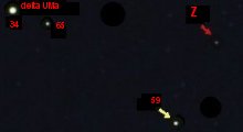 | Both images indicate the variable Z UMa by a red arrow and a 5.9 magnitude star by a yellow arrow. The bright star in the upper left corner of the images is delta UMa and helps locate the variable Z UMa. The image on the left shows Z UMa at minimum on April 5, 1995 JD 2449812.65, and is indicated by the first red line on the light curve below. The image on the right shows Z UMa at maximum on April 28, 1995 JD 2449835.73 and is indicated by the second red line on the curve below. | |