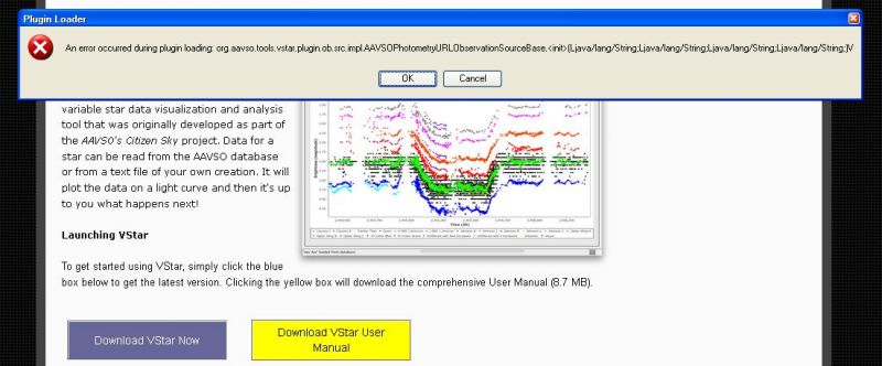 I can't run VStar 2.16.3 from webstart or off-line. I get the attached error message. Removing all the plugins from my off-line version didn't fix the problem. My computer is Windows 7 Home Premium 64 bit. Cheers,