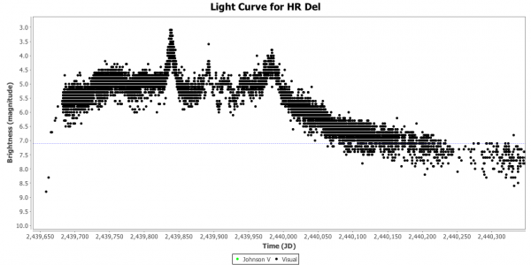 One year after discovery, HR Del was still a naked eye object at magnitude 5.7.